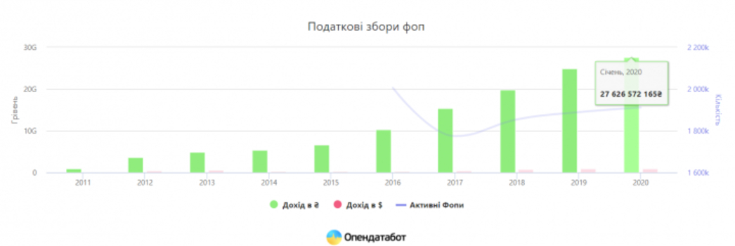 При этом доходы от ФЛП у государства постоянно растут - в 2019 году бюджет получил от них около 1 млрд долларов. С одного ФЛП в среднем государство получает 14,452 грн, в общем доход составляет 27,6 млрд грн. Отмечается, что за 8 лет поступления от ФЛП выросли в 24 раза, в т.ч. за последние два года - на 10 млрд грн, с 15,4 млрд грн в 2017 году до почти 25 млрд грн в 2019 году.