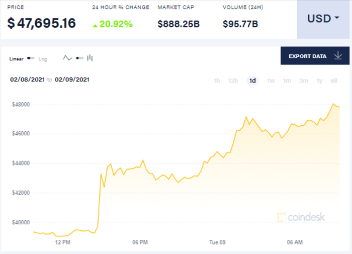 Так, на 9:00 утра 9 февраля биткоин торгуется по 47,695.16 доллара. С начала суток биткоин вырос до 44803 долларов за единицу, к шести часам утра он вырос до 46643 долларов, к девяти часам утра он еще сильнее вырос - до 47,695.16 доллара за единицу. Таким образом, рост биткоина за одни сутки составил более 8650 долларов.