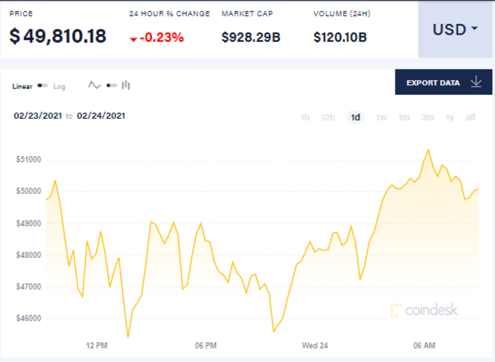 По состоянию на 24 февраля 2021 года основная криптовалюта мира - биткоин - продолжает балансировать в районе 49-50 тысяч долларов.