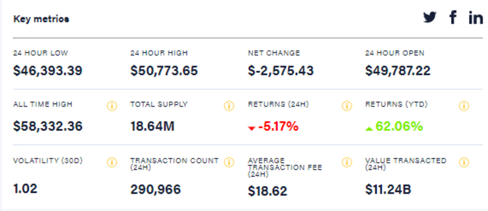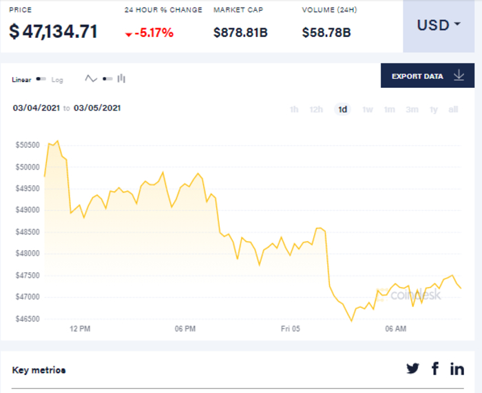 По состоянию на 5 марта 2021 года основная криптовалюта мира - биткоин - просела до почти 47 тысяч долларов.
