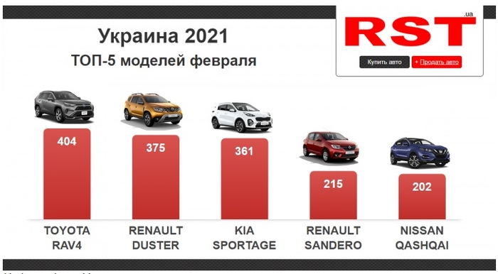 Наиболее популярными марками авто в феврале стали Toyota, Renault, Skoda, Kia и Nissan, а самой продаваемой моделью стала Toyota RAV4 – свыше 6% от числа всех продаж.