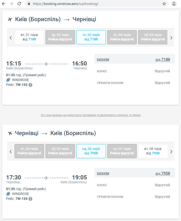 Из Киева вылет запланирован на 15:15 с прилетом в Черновцы в 16:50, а обратный рейс – на 17:30 с прилетом в Киев в 19:05. Время перелета составил около 1,5 часов.