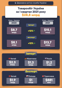 За первый квартал 2021 года (январь-март) товарооборот Украины вырос на 3,1 млрд. долларов, по сравнению с началом прошлого года до 28,8 млрд. долларов.