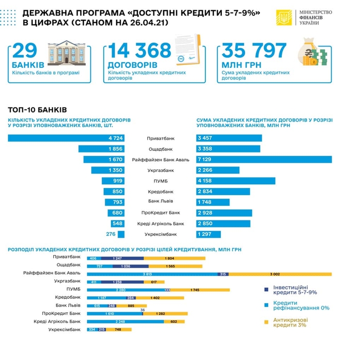 Так, с 19 по 23 апреля банки, которые участвуют в госпрограмме, всего выдали 709 кредитов, а за весь период работы программы — 14 368 кредитов на сумму 35,8 млрд грн. Из них 15,7 млрд грн были выданы в качестве рефинансирования предварительно полученных кредитов.