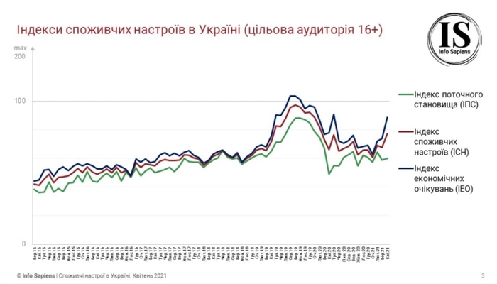 В Украине в апреле текущего года индекс потребительских настроений (ИПН) составил 77,2 п., что на 9,4 п. превышает аналогичный показатель предыдущего месяца. Об этом свидетельствуют данные ежемесячного исследования компании Info Sapiens.