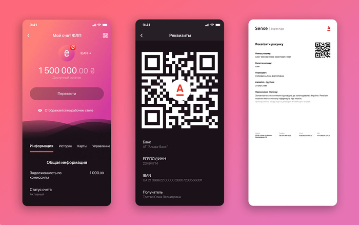 QR-код з реквізитами бізнес-рахунку. Передати партнерам реквізити для оплати можна як в стандартному вигляді, так і за допомогою QR-коду, який зручно зчитати камерою смартфона. Щоб отримати такий QR-код, потрібно натиснути на символ QR біля номера IBAN або перейти до розділу інформації за рахунком і зробити все там.