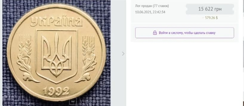 Так, например, владелец монеты номиналом 1 гривна 1992 года выпуска выставил ее на аукцион. Он отметил, что на копейке сохранилось 95% рельефа. Из-за хорошей сохранности внешнего вида монеты, ее продали за 15,6 тыс. грн. Стоит отметить, что по данному лоту ставки повышали 77 раз.
