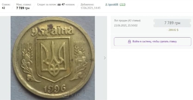 Такую же монету 1996 года выпуска продали на аукционе за 7,7 тыс. грн. На ней рельеф немного поврежден, поэтому и цена была ниже. Тем не менее по данному лоту ставки повышали 42 раза.
