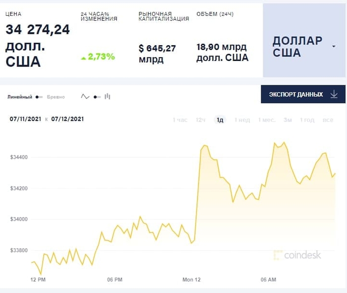 Стоит отметить, что по состоянию на 11:00 12 июля биткоин торгуется в районе $34,27 тыс. Что касается его рыночной капитализации, то она составила $645 млрд. В целом с начала года биткоин подорожал на 18,20%.