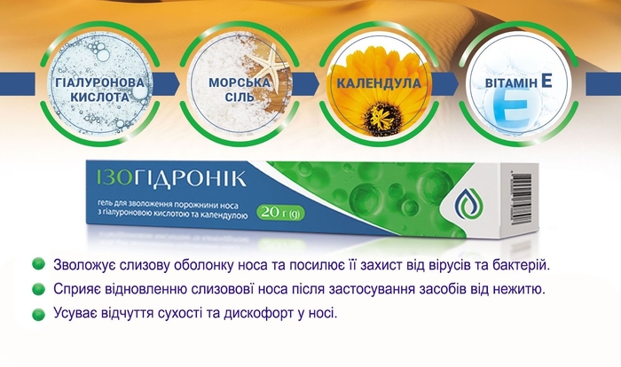 Оптимально використовувати для цього - ізогідронік гель з гіалуроновою кислотою і календулою. Від інших препаратів подібної дії він відрізняється своєю формою - це мукоадгезівний гель. Тобто, препарат обволікає зсередини слизову носа, зволожує та посилює її захисну функцію. Завдяки гелеподібній формі - це зручний та економний засіб.