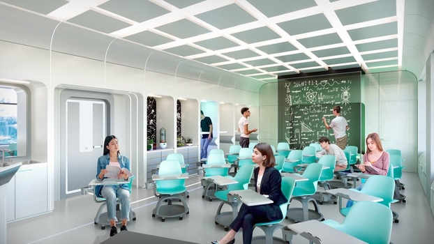 - Дизайн и мебель. Чтобы обеспечить высокий уровень комфорта всем возрастам студентов, дизайнеры реализовали в студенческом ресторане различные конфигурации столов и стульев, зеленые деревья, беседки и маленькие фонтаны, чтобы создать множество уютных и больших открытых зон отдыха. Обеденный зал также включает в себя специальную демонстрационную зону и зону для приготовления пищи для проведения как школьных, так и дополнительных занятий.