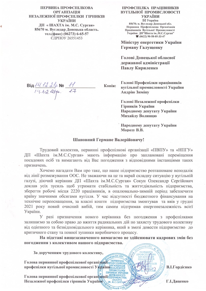Трудовой коллектив и профсоюзные организации государственного предприятия «Шахта им. М.С. Сургая» обнародовали письмо министру энергетики Герману Галущенко. В нем шахтеры требуют от чиновника не проводить кадровых изменений на шахте без согласования с ее работниками. По информации коллектива шахты, данное решение сейчас обсуждается в Минэнерго.