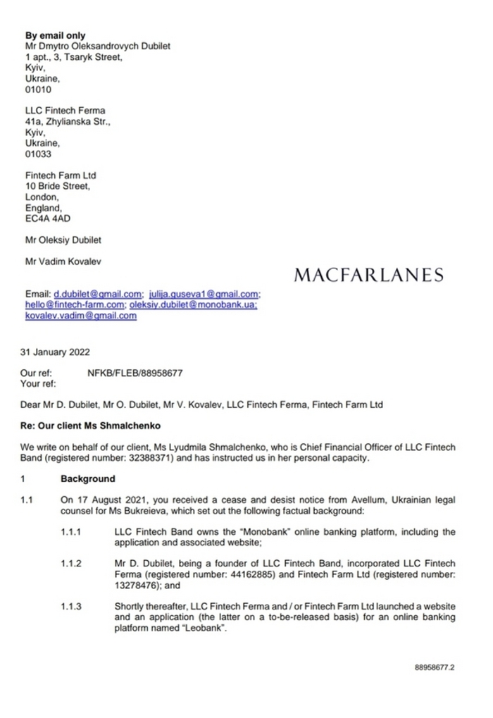 Стало известно, что Дмитрий Дубилет и его компании ООО "Финтех Ферма" (Украина), Fintech Farm (Лондон) получили официальное уведомление от британских адвокатов ООО "Fintech Band" (владельца "Монобанка") о подозрении в хищении интеллектуальной собственности, передают Украинские Новости.