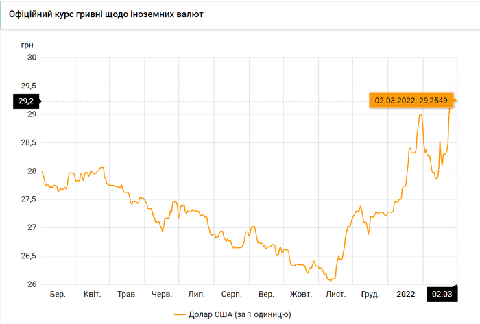 Курс валют на 2.03.2022: Доллар зафиксирован на уровне 29,25 грн