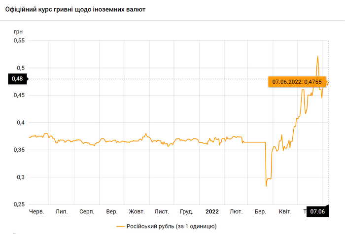 - 100 российских рублей – 47,5 грн. (4,75 за 10 рублей, +7 коп.)