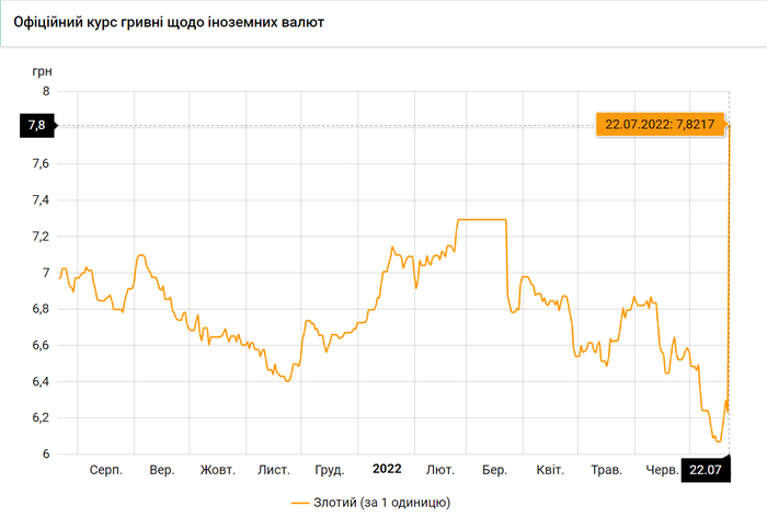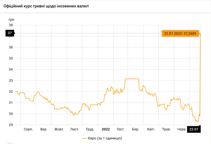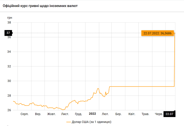 Ранее мы писали, что 21 июля 2022 года Национальный банк Украины скорректировал официальный курс гривны к доллару США на 25% до 36,5686 грн/долл.