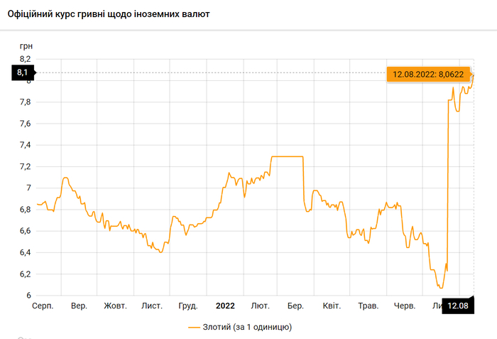 - 100 польских злотых – 806 грн. (8,06 за злотый, +9 коп.)