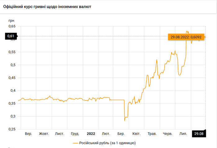 - 100 российских рублей – 60,9 грн. (6,09 за 10 рублей, 0 коп.)