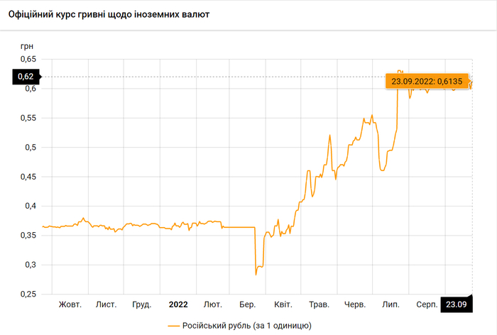 - 100 российских рублей – 61,3 грн. (6,13 за 10 рублей, +14 коп.)