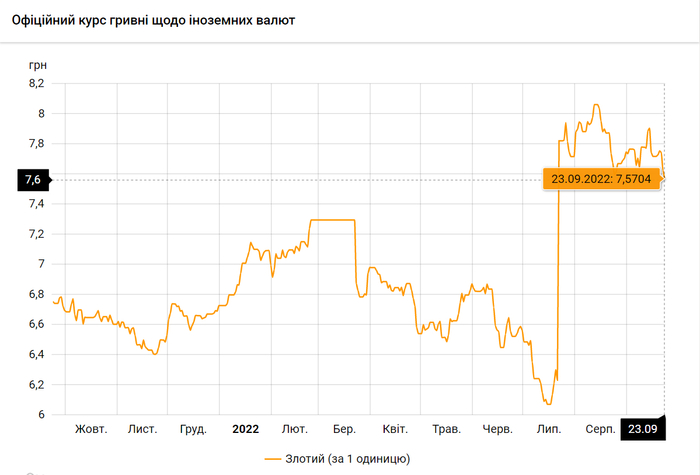 - 100 польских злотых – 757 грн. (7,57 за злотый, -5 коп.)