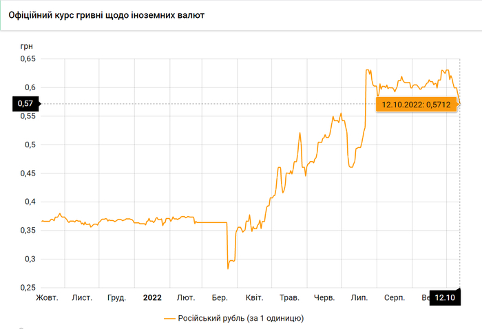 - 100 российских рублей – 57,1 грн. (5,71 за 10 рублей, -10 коп.)