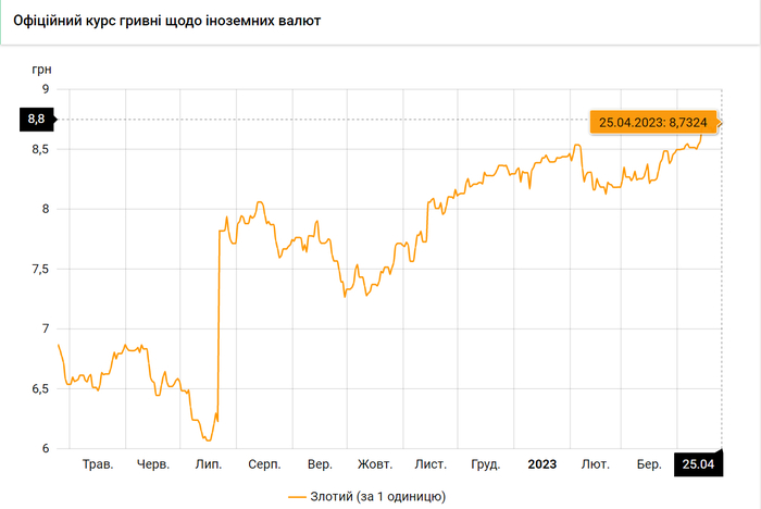 - 100 польских злотых – 873 грн. (8,73 за злотый, +3 коп.)
