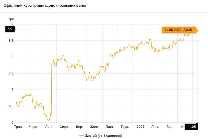 - 100 польских злотых – 883 грн. (8,83 за злотый, +6 коп.)