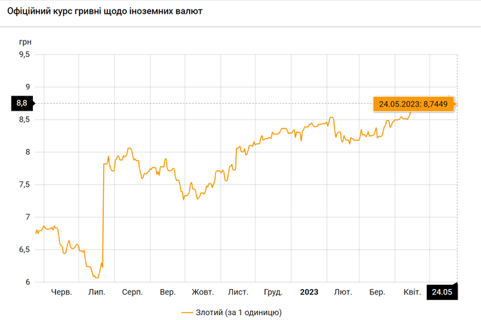 - 100 польских злотых – 874 грн. (8,74 за злотый, -1 коп.)