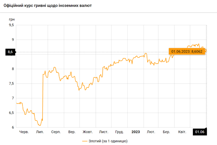 - 100 польских злотых – 860 грн. (8,60 за злотый, -8 коп.)