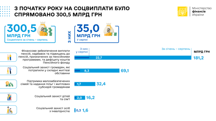 - 69,1 млрд грн, из них в августе 8,3 млрд грн - на социальную защиту граждан, попавших в сложные жизненные обстоятельства;