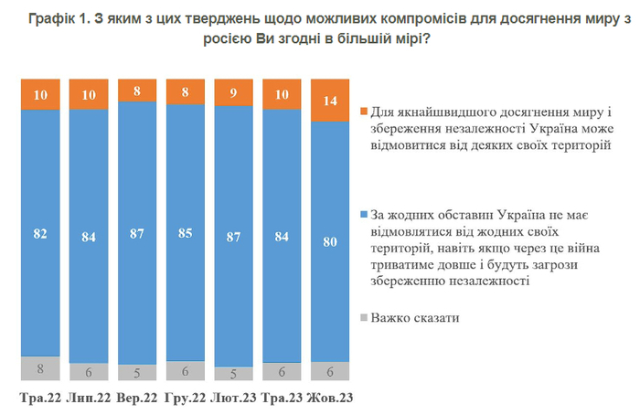 Так, 80% населения (в мае 2023 года - 84%) сохраняют уверенность, что никакие территориальные уступки не допустимы, даже если из-за этого война будет продолжаться дольше и будут другие угрозы.