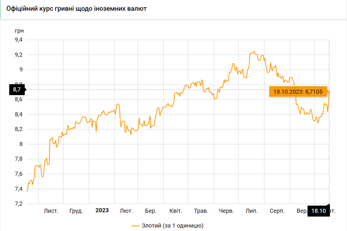 - 100 польских злотых – 871 грн. (8,71 за злотый, +16 коп.)