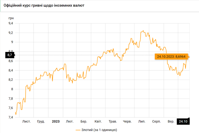 - 100 польских злотых – 869 грн. (8,69 за злотый, +3 коп.)