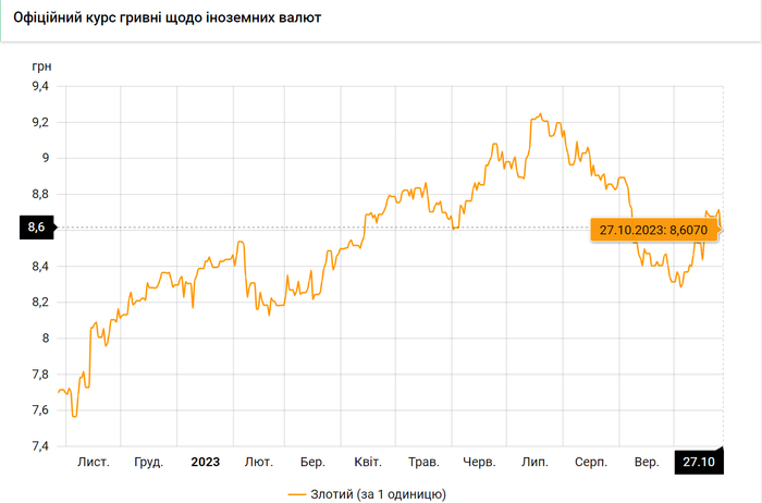 - 100 польских злотых – 860 грн. (8,60 за злотый, -1 коп.)