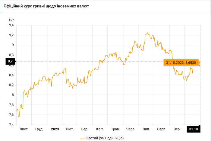 - 100 польских злотых – 865 грн. (8,65 за злотый, +8 коп.)