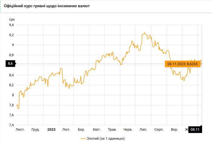 - 100 польских злотых – 862 грн. (8,62 за злотый, -4 коп.)