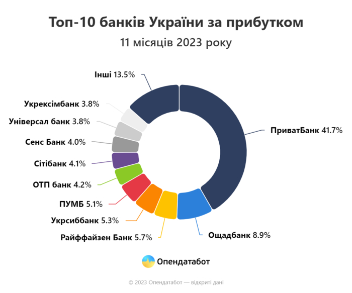При этом на 5 государственных банков приходится 61,5% от общей прибыли. Из них 41,7% или 54,46 млрд грн заработал ПриватБанк, который стабильно удерживает лидерство.