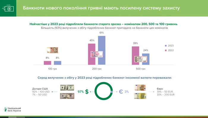 Уровень подделки банкнот иностранной валюты в прошлом году также был низким. За 2023 год банки и финансовые учреждения по всей Украине изъяли из обращения менее 700 поддельных банкнот иностранной валюты (в 2022 году - около 600).