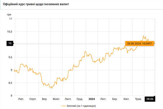 - 100 польских злотых – 1004 грн. (10,04 за злотый, -1 коп.)