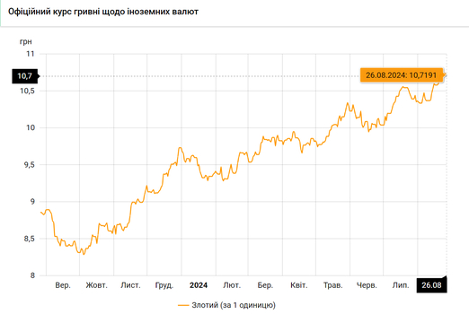 - 100 польских злотых – 1071 грн. (10,71 за злотый, -3 коп.)