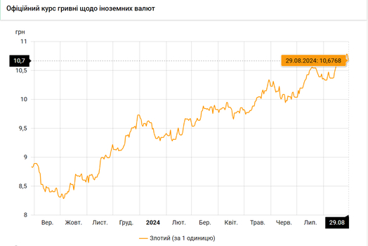 - 100 польских злотых – 1067 грн. (10,67 за злотый, -10 коп.)
