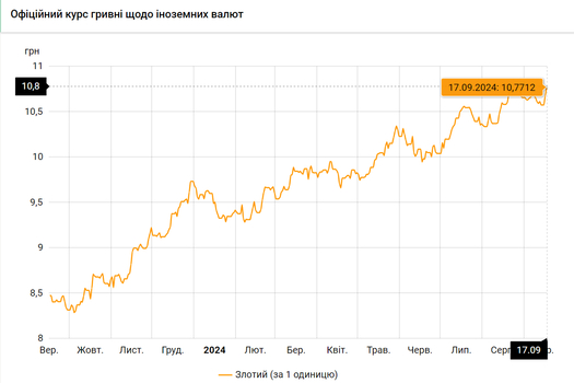 - 100 польских злотых – 1077 грн. (10,77 за злотый, +10 коп.)