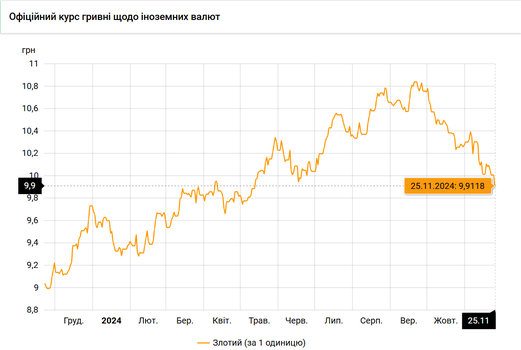 - 100 польских злотых – 991 грн. (9,91 за злотый, -9 коп.)