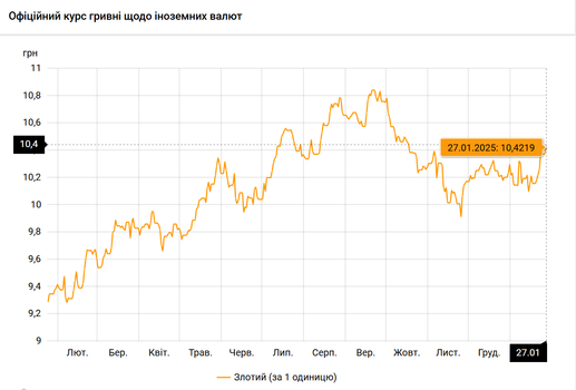 - 100 польских злотых – 1042 грн (10,42 за злотый, +5 коп.)