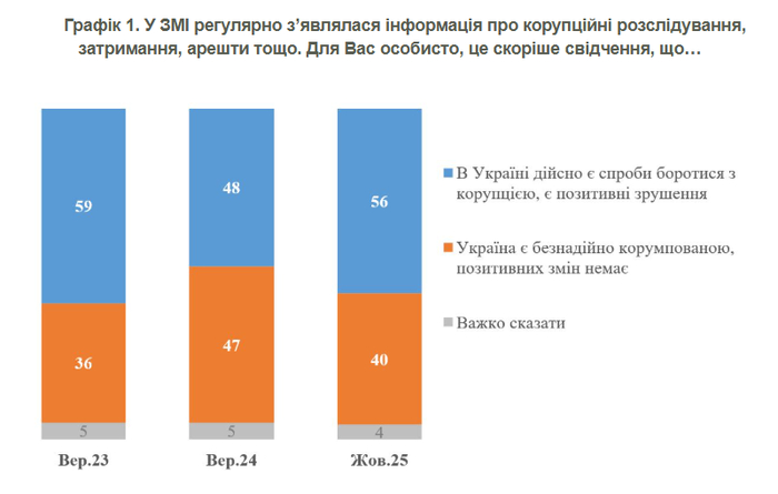 По состоянию на начало октября 2025 года более 50% украинцев считают, что в Украине есть действительно попытки бороться с коррупцией. Об этом свидетельствуют результаты опроса КМИС, передают Dengi.ua.