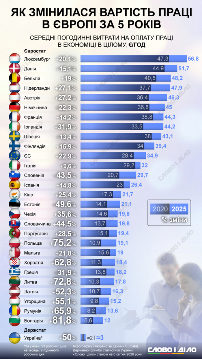 Средняя стоимость труда — важный экономический показатель, который позволяет понять уровень развития экономики, ситуацию на рынке труда и причины миграции работников. Аналитики "Слово и дело" сравнили, как изменились почасовые затраты на оплату труда в странах ЕС и Украине в 2020–2025 годах, сообщают Dengi.ua.
