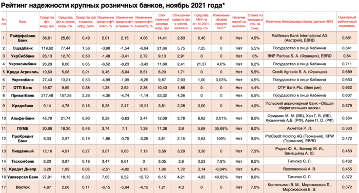 Для рейтинга использована отчетность банков на 01.10.2021, которая опубликована Нацбанком. В рейтинг крупных розничных банков вошли банки с активами свыше 15 млрд. грн. и депозитами физлиц более 1 млрд. грн. В рейтинг надежности средних и небольших розничных банков вошли банки с активами менее 15 млрд. грн. и портфелем депозитов физлиц свыше 1 млрд. грн.