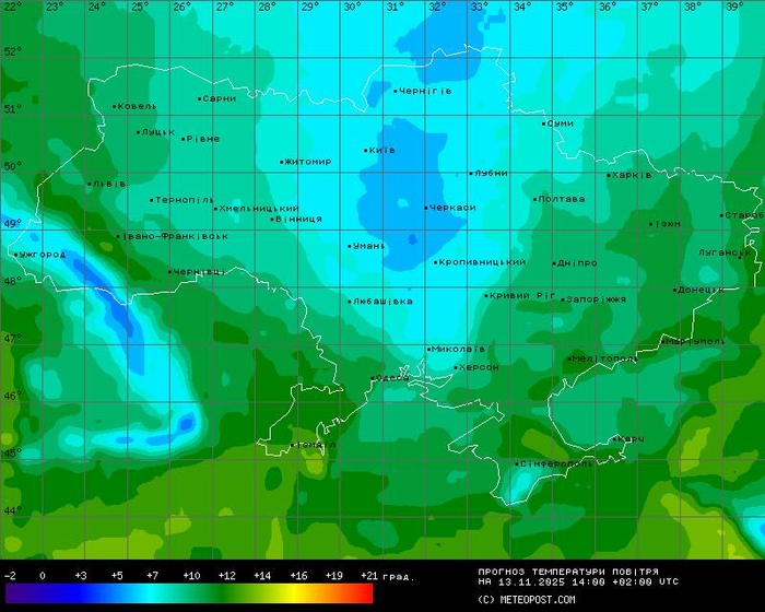 Самые высокие температуры прогнозируют в южной части и на западе страны - +9…+13°C. На остальной территории столбики термометров поднимутся до +7…+11°C. Прохладнее всего будет на Черниговщине, Киевщине и Черкасщине - только +5…+9°C.