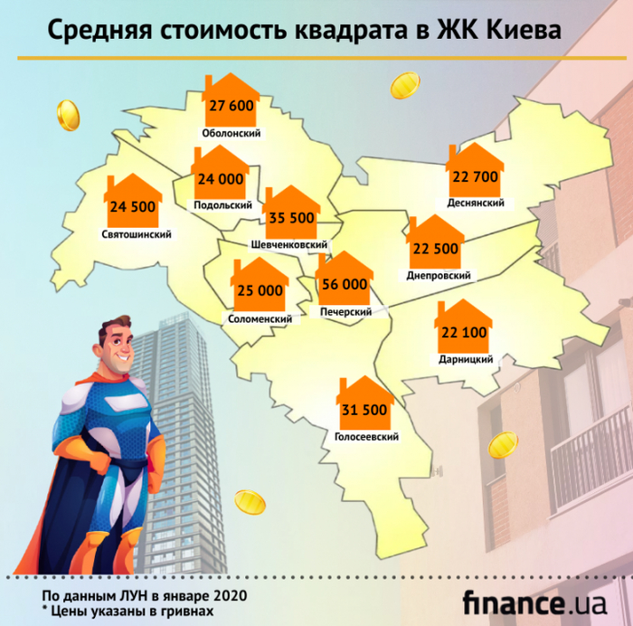 В среднем, стоимость квадратного метра в новостройках Киева в январе 2021 года достигла 28 тыс. грн, минимальная - примерно 19,5 тыс. грн/кв.м. Каковы средние цены на квадратный метр в разных районах столицы: