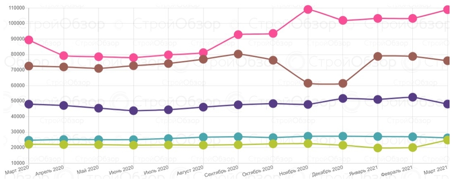Жилье класса "комфорт" наоборот начало дешеветь с начала года. Стабильностью цен такие квартиры тоже не отличались ранее, но за определенный промежуток времени можно было проследить четкую тенденцию скачков цены. В марте 2021 года квартиры подешевели на 3% до 26 340 гривен за "квадрат".